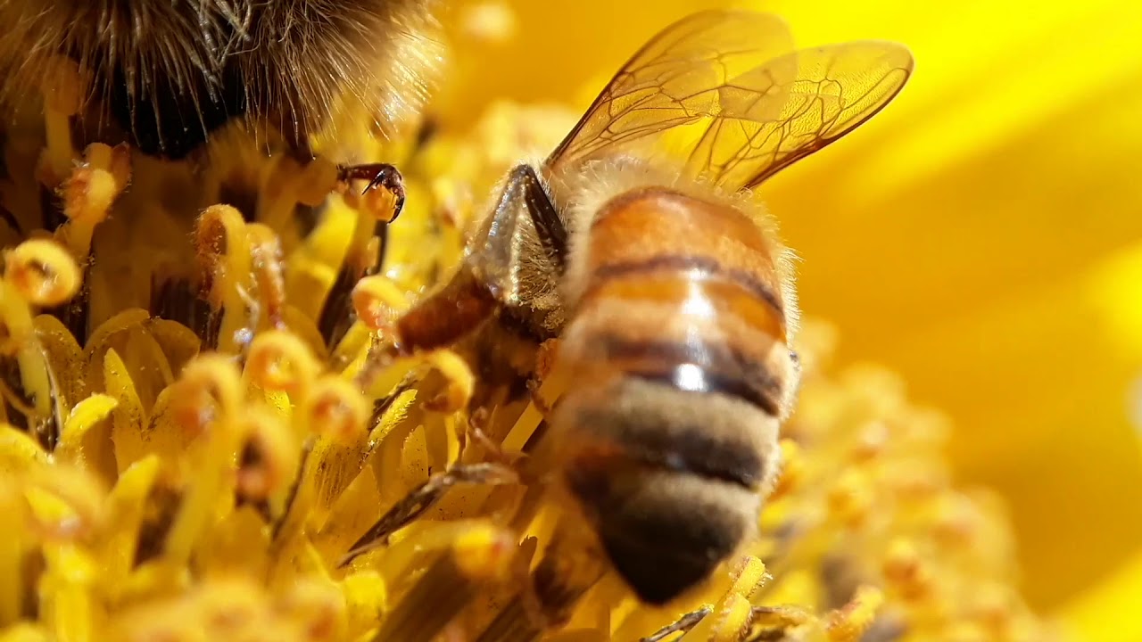 Story inside a sunflower. It's autumn, and the bees won't be active for much longer. They are getting slow, perhaps die soon, but for now they still gorge themselves. Bumblebee thought she had the flower all to herself, until the honeybee arrives. and so the disruption begins: endless sessions of loitering, feasting, cleaning, right in front of her. On purpose?