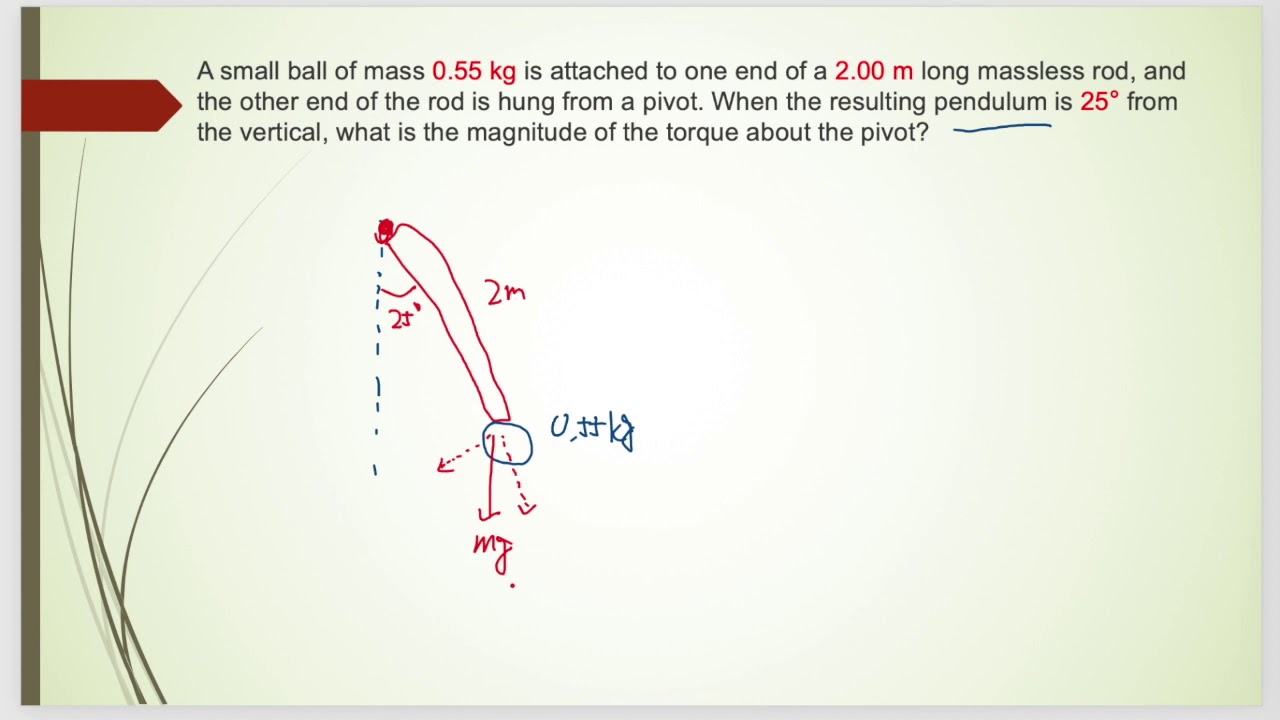 美國高中 AP Physics C ME HW44 #2 A small ball of mass 0.55 kg is attached to one end of a 2.00 m long massless rod, and the other end of the rod is hung from a pivot. When the resulting pendulum is 25° from the vertical, what is the magnitude of the torque about the pivot?